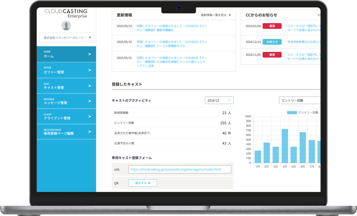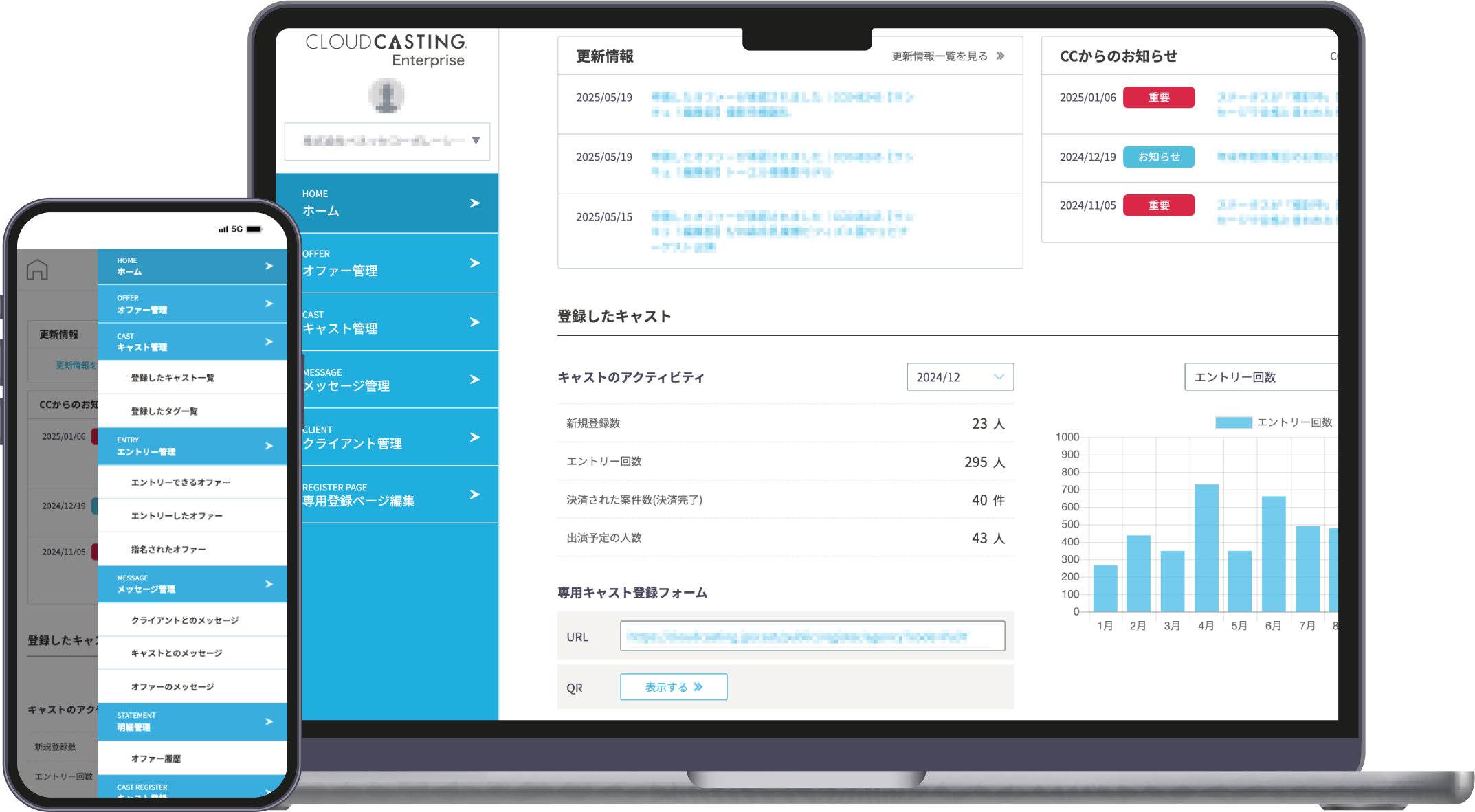 CSVや専用URLを使って、タレント情報を一括登録。プロフィール・写真・タグなども自由に編集・管理できます。